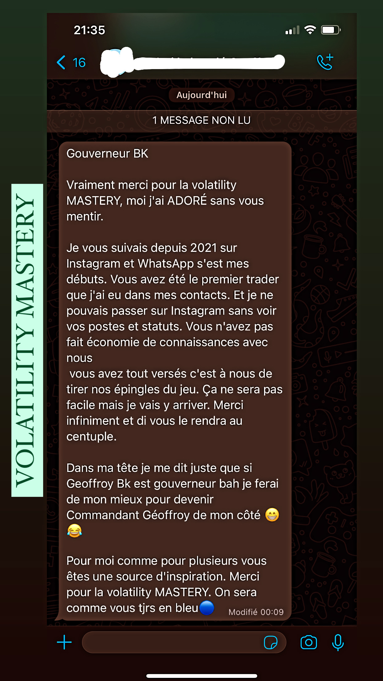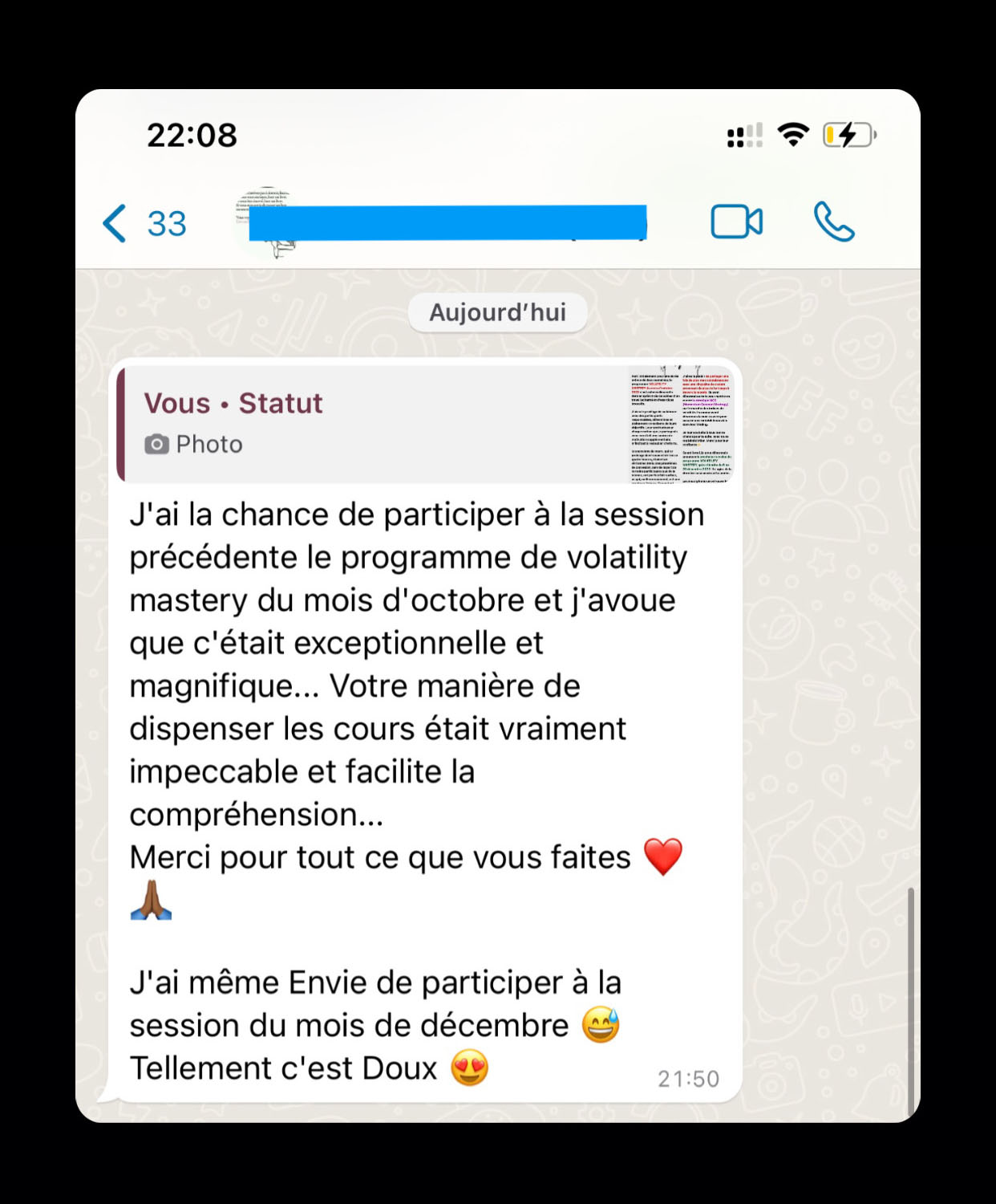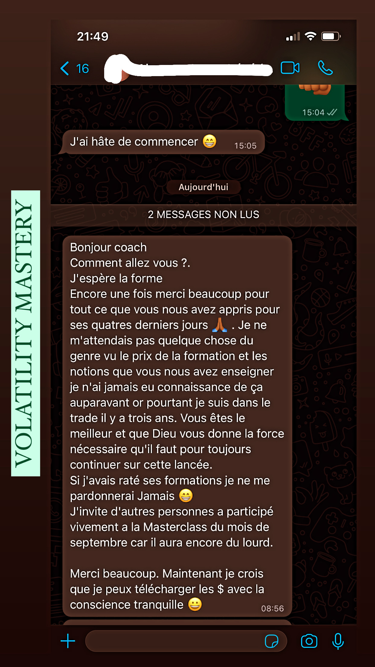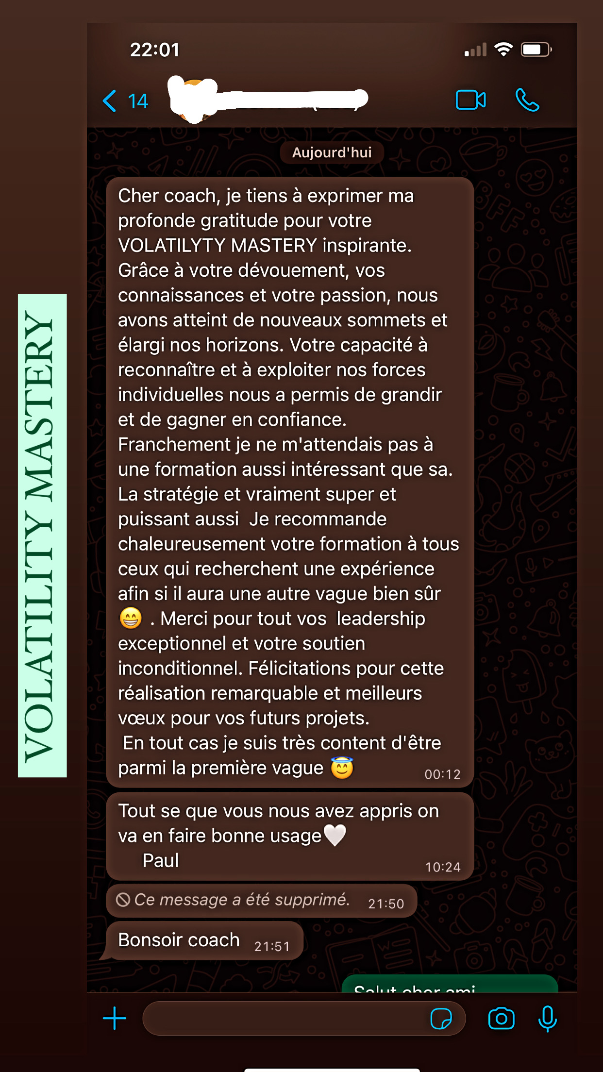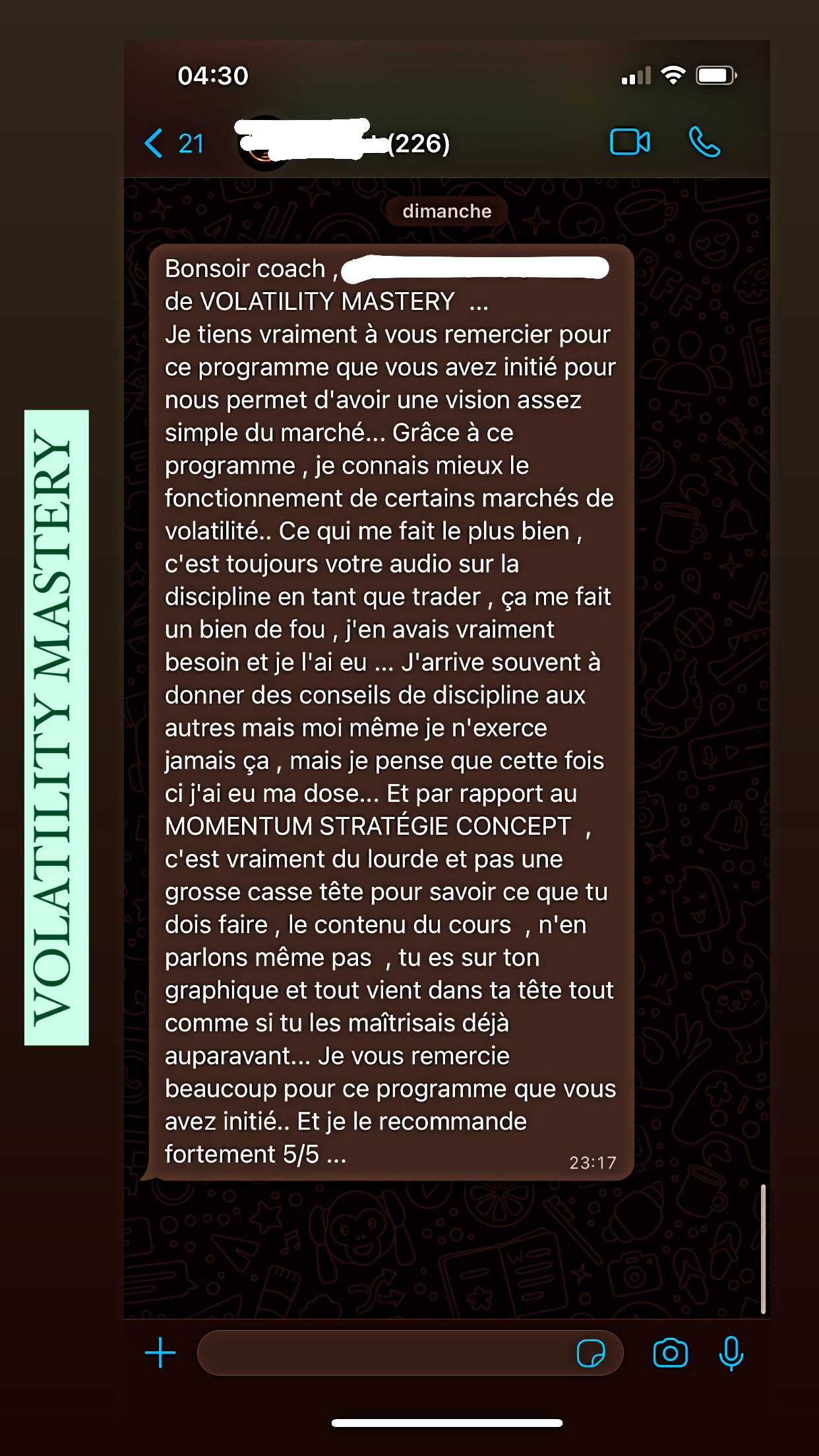 Deviens un Trader Rentable et Régulier sur le marché des Indices Synthétiques au bout de 03 Mois de formation et d'accompagnement privé, en utilisant des stratégies pratiques, testées et approuvées par des centaines de Traders ayant suivi ce même programme.