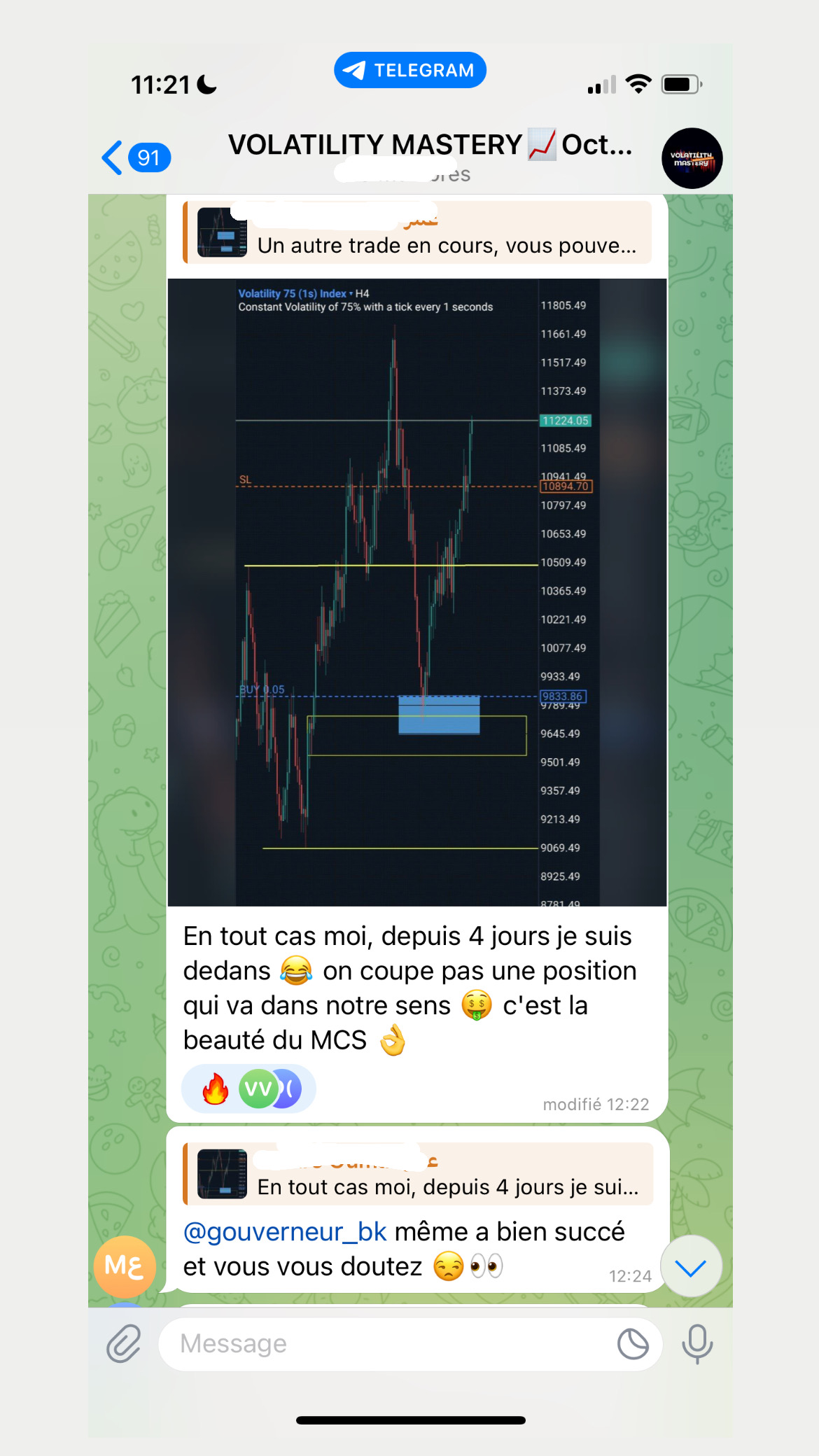 Tu auras accès à nos analyses, publiées en temps réel dès que des opportunités se présentent. Nous te montrons clairement, en vidéo, nos actions : où nous allons entrer en position, où nous placerons notre stop-loss, et où nous fixerons nos objectifs de profit. Cela te permettra te travailler ton appréhension du marché en prenant exemple sur nous.