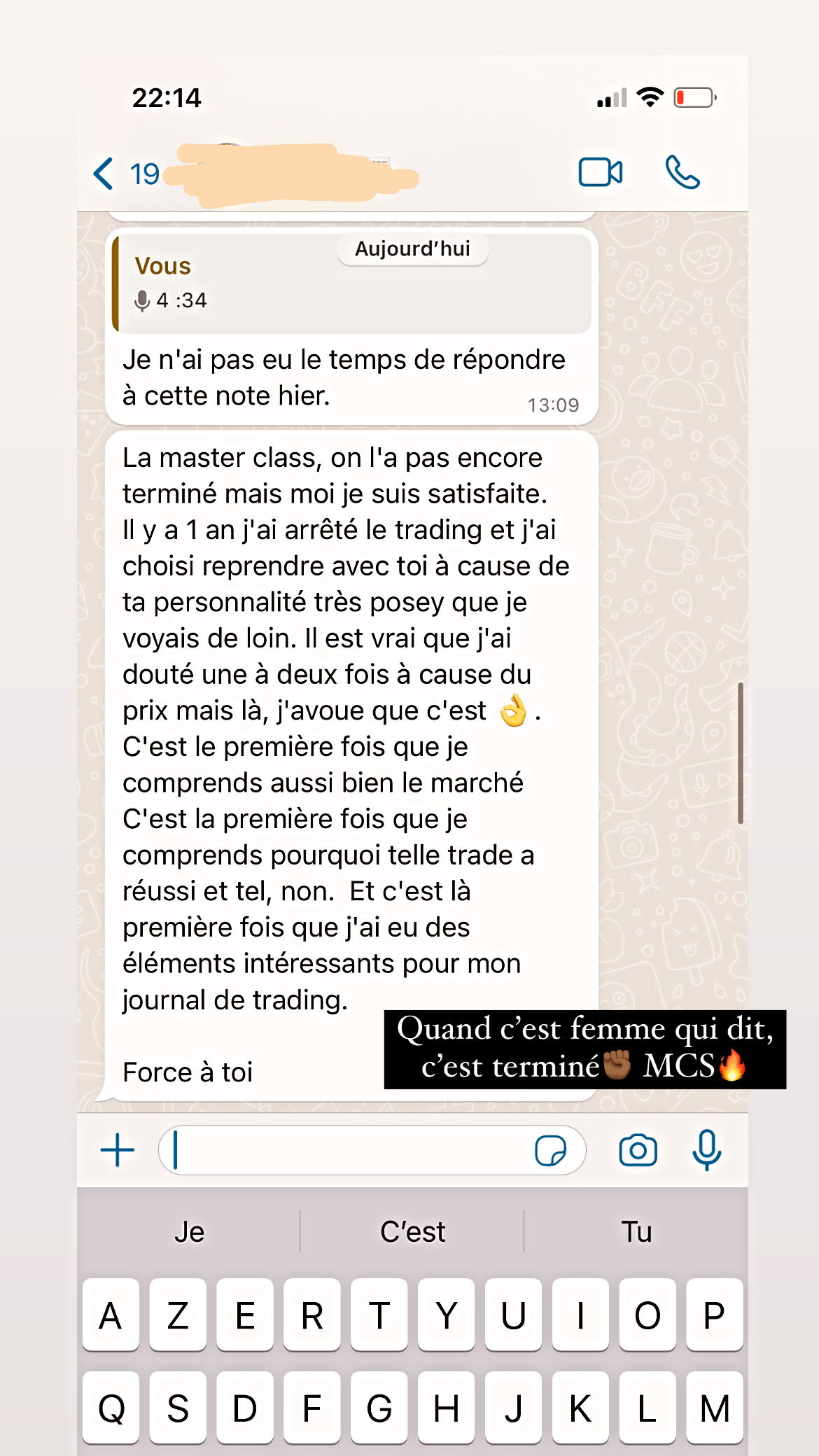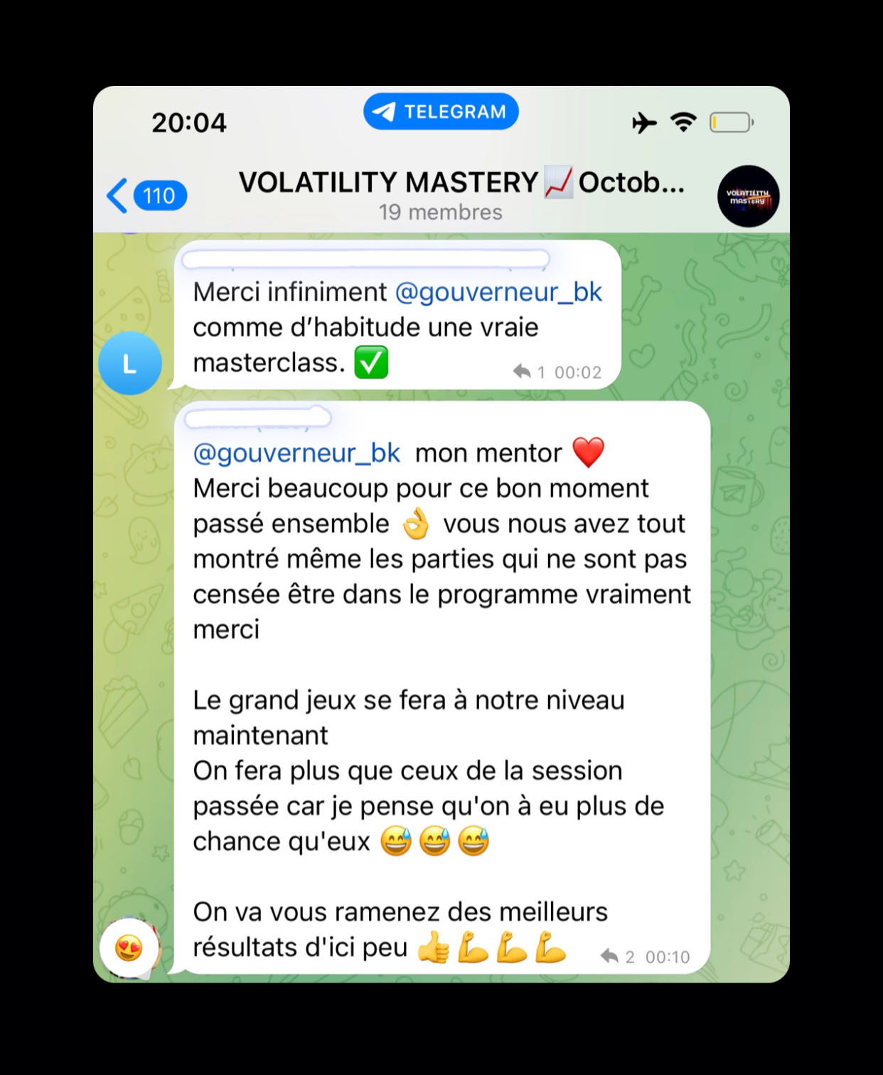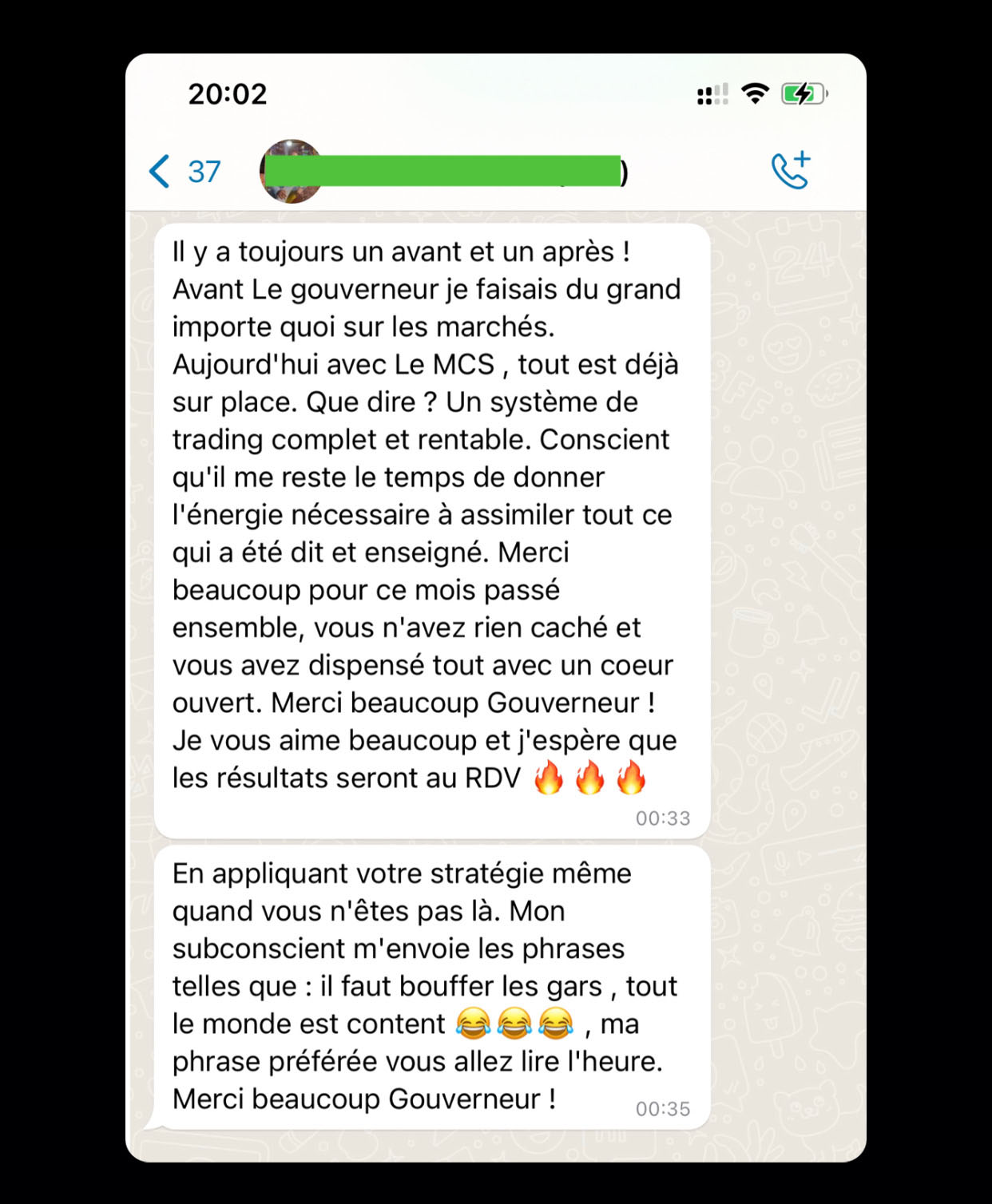 Après tes 03 mois de travail en toute indépendance, il est temps pour nous d'évaluer tes performances. Pourquoi cette étape supplémentaire ? Parce que la plupart des formateurs se foutent de ce que deviennent leurs étudiants après la formation. Ce n'est pas notre cas. Nous t'enverrons nous-même un mail au bout de ces 03 mois, pour te faire réserver un appel privé. Durant cet appel, on pourra ensemble évaluer tes résultats passées à travers ton journal de Trading, t'aider à apporter des améliorations à ton plan de Trading, afin de faire encore plus d'argent. Si durant cette cette période de travail, tu as rencontré des difficultés majeures ou des problèmes de psychologie et/ou de Mindset, on t'aidera à trouver des axes d'améliorations et comment les implémenter dans ton Trading, afin de réduire le stress et la pression que ce métier peut engendrer à long terme. Après cet appel, tu auras tous les outils nécessaires pour passer la barre des 100.000 $ dans ton Trading. Et devines quoi ? Cet appel est animé par le Gouverneur lui-même en personne.