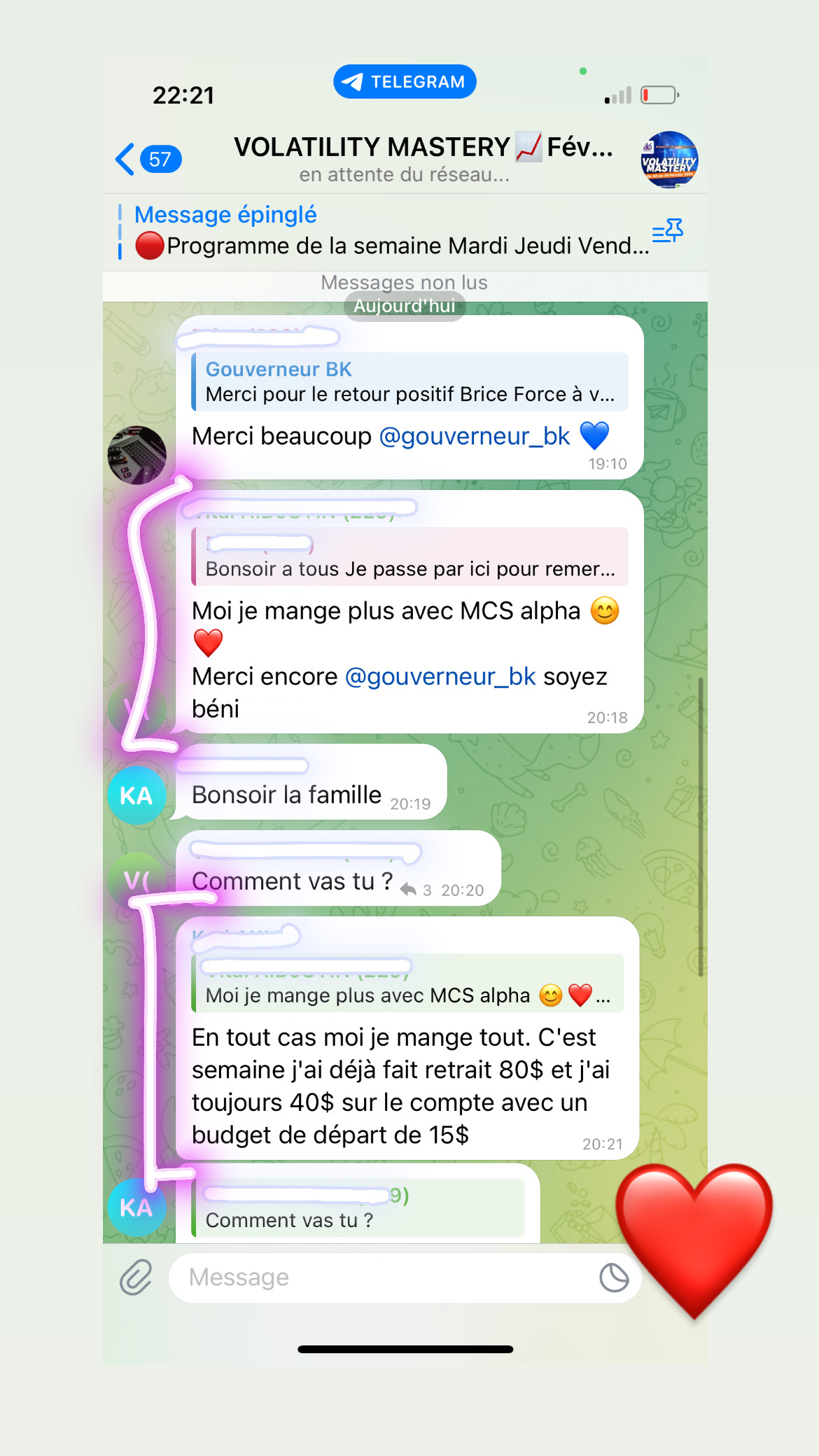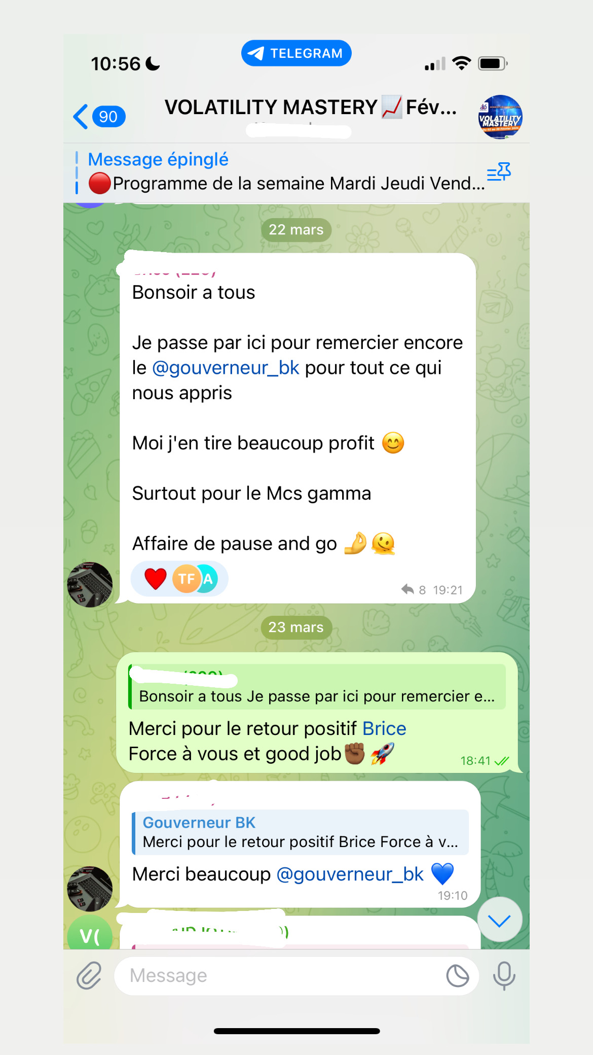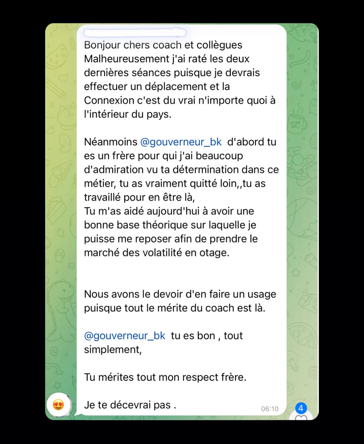 A la fin de tes 04 semaines de formation et de coaching privé, tu seras invité à rejoindre le groupe d'accompagnement collectif. A travers ce groupe, tu pourras interagir et travailler en équipe avec d'autres Traders du programme. Il s'agit ici d'un coaching groupé qui dure 08 semaines, ayant pour objectif de t'aider à pratiquer le Trading de façon plus avancée en déployant toutes les connaissances acquises lors de ta formation. Tu auras droit à une séance de travail en groupe, toutes les semaines, animée par un coach de l'académie. Encore une fois, tu ne seras pas seul, le groupe est encadré par deux coachs expérimentés qui accompagnent rigoureusement nos étudiants depuis plusieurs années.
